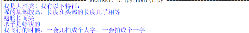 print("我是大雁类!我有以下特征:")