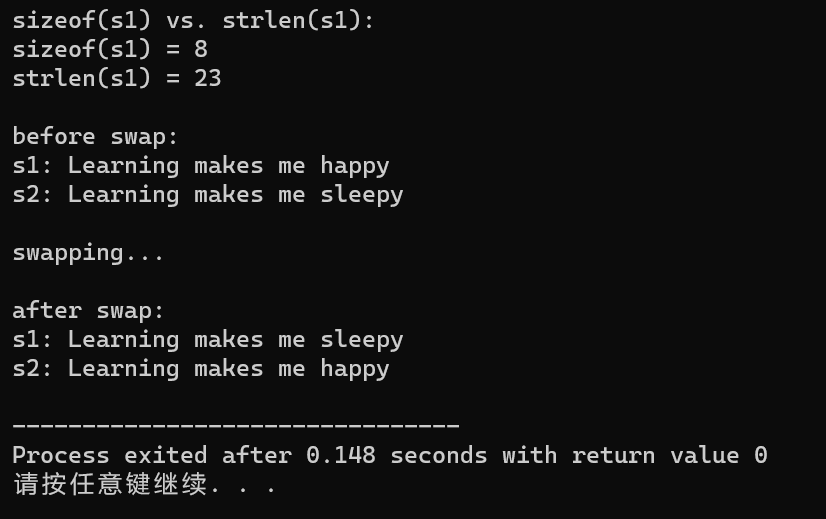 #include <stdio.h> #include <string.h> #define N 80 int main() { char *s1 = "Learning makes me happy"; char *s2 = "Learning makes me sleepy"; char *tmp; printf("sizeof(s1) vs. strlen(s1): \n"); printf("sizeof(s1) = %d\n", sizeof(s1)); printf("strlen(s1) = %d\n", strlen(s1)); printf("\nbefore swap: \n"); printf("s1: %s\n", s1); printf("s2: %s\n", s2); printf("\nswapping...\n"); tmp = s1; s1 = s2; s2 = tmp; printf("\nafter swap: \n"); printf("s1: %s\n", s1); printf("s2: %s\n", s2); return 0; }