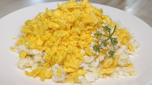 - 待蛋清固定后,用锅铲将蛋黄搅散,使其与蛋清混合。