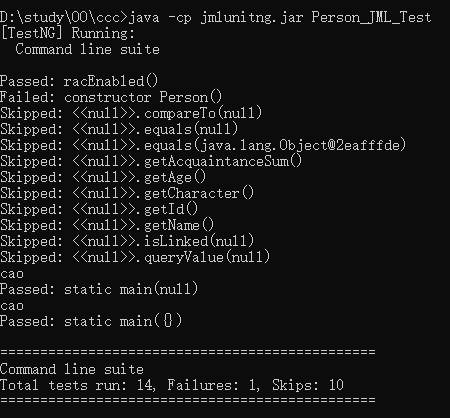 本来想采用JMLUnitNG对MyGroup进行测试,但它无论如何也跑不起来,又是建议升级编译器又是警告无法找到注释方法啥的,换jdk改环境变量啥的都不行,也找不到解决方法。然后我参考了一下往年的博客,抱着试一试的心态尝试了一下里面给的测试方法,发现居然没出啥问题……于是没办法,只能用刚刚这个Person来做测试。这个类在刚才的基础上被加上了main方法,结果如下:
