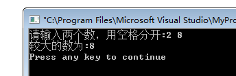 5.输入两个数,输出较大数。#include<stdio.h>main(){ int a,b,c; printf("请输入两个数,用空格分开:"); scanf("%d %d",&a,&b); if(a>b) c=a; else c=b; printf("较大的数为:%d\n",c);} |