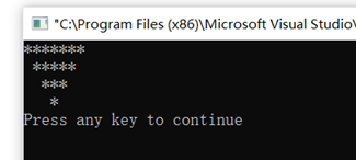 #include<stdio.h>main(){ int i,j,k; for(i=1;i<=4;i++){ for(j=0;j<i-1;j++){ printf(" "); } for(k=7;k>=2*i-1;k--){ printf("*"); } printf("\n"); }} |