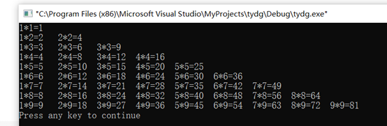 3.编写程序,打印“九乘法表”。#include<stdio.h>main(){ int i,j; for(i=1;i<=9;i++){ for(j=1;j<=i;j++){ printf("%d*%d=%d\t",j,i,i*j); } printf("\n"); }} |