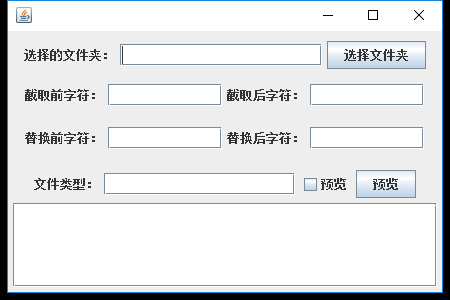 1 import java.awt.BorderLayout; 2 3 import java.awt.EventQueue; 4 5 import java.awt.GridLayout; 6 7 import java.awt.event.ActionEvent; 8 9 import java.awt.event.ActionListener; 10 11 import java.io.File; 12 13 import javax.swing.JButton; 14 15 import javax.swing.JCheckBox; 16 17 import javax.swing.JFileChooser; 18 19 import javax.swing.JFrame; 20 21 import javax.swing.JLabel; 22 23 import javax.swing.JOptionPane; 24 25 import javax.swing.JPanel; 26 27 import javax.swing.JScrollPane; 28 29 import javax.swing.JTextArea; 30 31 import javax.swing.JTextField; 32 33 import javax.swing.border.EmptyBorder; 34 35 import java.awt.event.ItemListener; 36 37 import java.awt.event.ItemEvent; 38 39 public class RenameTool extends JFrame { 40 /** 41 42 * 43 44 */ 45 46 private static final long serialVersionUID = 9068225199875097200L; 47 48 private JPanel contentPane; 49 50 private JTextField selectTextField; 51 52 private JTextField beforeCutTextField; 53 54 private JTextField afterCutTextField; 55 56 private JTextField beforeReplaceTextField; 57 58 private JTextField afterReplaceTextField; 59 60 private JTextField fileTypeTextField; 61 62 private JCheckBox choiceCheckBox; 63 64 private JButton renameButton; 65 66 private File[] selectFiles; 67 68 private JTextArea textArea; 69 70 /** 71 72 * Launch the application. 73 74 */ 75 76 public static void main(String[] args) { 77 EventQueue.invokeLater(new Runnable() { 78 public void run() { 79 try { 80 RenameTool frame = new RenameTool(); 81 82 frame.setVisible(true); 83 84 } catch (Exception e) { 85 e.printStackTrace(); 86 87 } 88 89 } 90 91 }); 92 93 } 94 95 /** 96 97 * Create the frame. 98 99 */ 100 101 public RenameTool() { 102 setDefaultCloseOperation(JFrame.EXIT_ON_CLOSE); 103 104 setBounds(100, 100, 450, 300); 105 106 contentPane = new JPanel(); 107 108 contentPane.setBorder(new EmptyBorder(5, 5, 5, 5)); 109 110 contentPane.setLayout(new BorderLayout(0, 0)); 111 112 setContentPane(contentPane); 113 114 JPanel controlPanel = new JPanel(); 115 116 contentPane.add(controlPanel, BorderLayout.NORTH); 117 118 controlPanel.setLayout(new GridLayout(4, 1, 5, 5)); 119 120 JPanel selectPanel = new JPanel(); 121 122 controlPanel.add(selectPanel); 123 124 JLabel selectLabel = new JLabel("选择的文件夹:"); 125 126 selectPanel.add(selectLabel); 127 128 selectTextField = new JTextField(); 129 130 selectPanel.add(selectTextField); 131 132 selectTextField.setColumns(18); 133 134 JButton selectButton = new JButton("选择文件夹"); 135 136 selectButton.addActionListener(new ActionListener() { 137 public void actionPerformed(ActionEvent e) { 138 do_selectButton_actionPerformed(e); 139 140 } 141 142 }); 143 144 selectPanel.add(selectButton); 145 146 JPanel cutPanel = new JPanel(); 147 148 controlPanel.add(cutPanel); 149 150 JLabel beforeCutLabel = new JLabel("截取前字符:"); 151 152 cutPanel.add(beforeCutLabel); 153 154 beforeCutTextField = new JTextField(); 155 156 cutPanel.add(beforeCutTextField); 157 158 beforeCutTextField.setColumns(10); 159 160 JLabel afterCutLabel = new JLabel("截取后字符:"); 161 162 cutPanel.add(afterCutLabel); 163 164 afterCutTextField = new JTextField(); 165 166 cutPanel.add(afterCutTextField); 167 168 afterCutTextField.setColumns(10); 169 170 JPanel replacePanel = new JPanel(); 171 172 controlPanel.add(replacePanel); 173 174 JLabel beforeReplaceLabel = new JLabel("替换前字符:"); 175 176 replacePanel.add(beforeReplaceLabel); 177 178 beforeReplaceTextField = new JTextField(); 179 180 replacePanel.add(beforeReplaceTextField); 181 182 beforeReplaceTextField.setColumns(10); 183 184 JLabel afterReplaceLabel = new JLabel("替换后字符:"); 185 186 replacePanel.add(afterReplaceLabel); 187 188 afterReplaceTextField = new JTextField(); 189 190 replacePanel.add(afterReplaceTextField); 191 192 afterReplaceTextField.setColumns(10); 193 194 JPanel otherPanel = new JPanel(); 195 196 controlPanel.add(otherPanel); 197 198 JLabel fileTypeLabel = new JLabel("文件类型:"); 199 200 otherPanel.add(fileTypeLabel); 201 202 fileTypeTextField = new JTextField(); 203 204 otherPanel.add(fileTypeTextField); 205 206 fileTypeTextField.setColumns(17); 207 208 choiceCheckBox = new JCheckBox("预览"); 209 210 choiceCheckBox.addItemListener(new ItemListener() { 211 public void itemStateChanged(ItemEvent e) { 212 do_choiceCheckBox_itemStateChanged(e); 213 214 } 215 216 }); 217 218 otherPanel.add(choiceCheckBox); 219 220 renameButton = new JButton("预览"); 221 222 renameButton.addActionListener(new ActionListener() { 223 public void actionPerformed(ActionEvent e) { 224 do_renameButton_actionPerformed(e); 225 226 } 227 228 }); 229 230 otherPanel.add(renameButton); 231 232 JScrollPane scrollPane = new JScrollPane(); 233 234 contentPane.add(scrollPane, BorderLayout.CENTER); 235 236 textArea = new JTextArea(); 237 238 scrollPane.setViewportView(textArea); 239 240 } 241 242 protected void do_selectButton_actionPerformed(ActionEvent e) { 243 JFileChooser chooser = new JFileChooser(); 244 245 chooser.setFileSelectionMode(JFileChooser.DIRECTORIES_ONLY); 246 247 chooser.setMultiSelectionEnabled(false); 248 249 int result = chooser.showOpenDialog(this); 250 251 if (result == JFileChooser.APPROVE_OPTION) { 252 File directory = chooser.getSelectedFile(); 253 254 selectTextField.setText(directory.getAbsolutePath()); 255 256 selectFiles = directory.listFiles(); 257 258 for (File selectFile : selectFiles) { 259 textArea.append(selectFile.getAbsolutePath() "\n\r"); 260 261 } 262 263 } 264 265 } 266 267 protected void do_choiceCheckBox_itemStateChanged(ItemEvent e) { 268 if (choiceCheckBox.isSelected()) { 269 choiceCheckBox.setText("重命名"); 270 271 renameButton.setText("重命名"); 272 273 } else { 274 choiceCheckBox.setText("预览"); 275 276 renameButton.setText("预览"); 277 278 } 279 280 } 281 282 protected void do_renameButton_actionPerformed(ActionEvent e) { 283 String beforeCut = beforeCutTextField.getText();// 获得截取前字符串 284 285 String afte