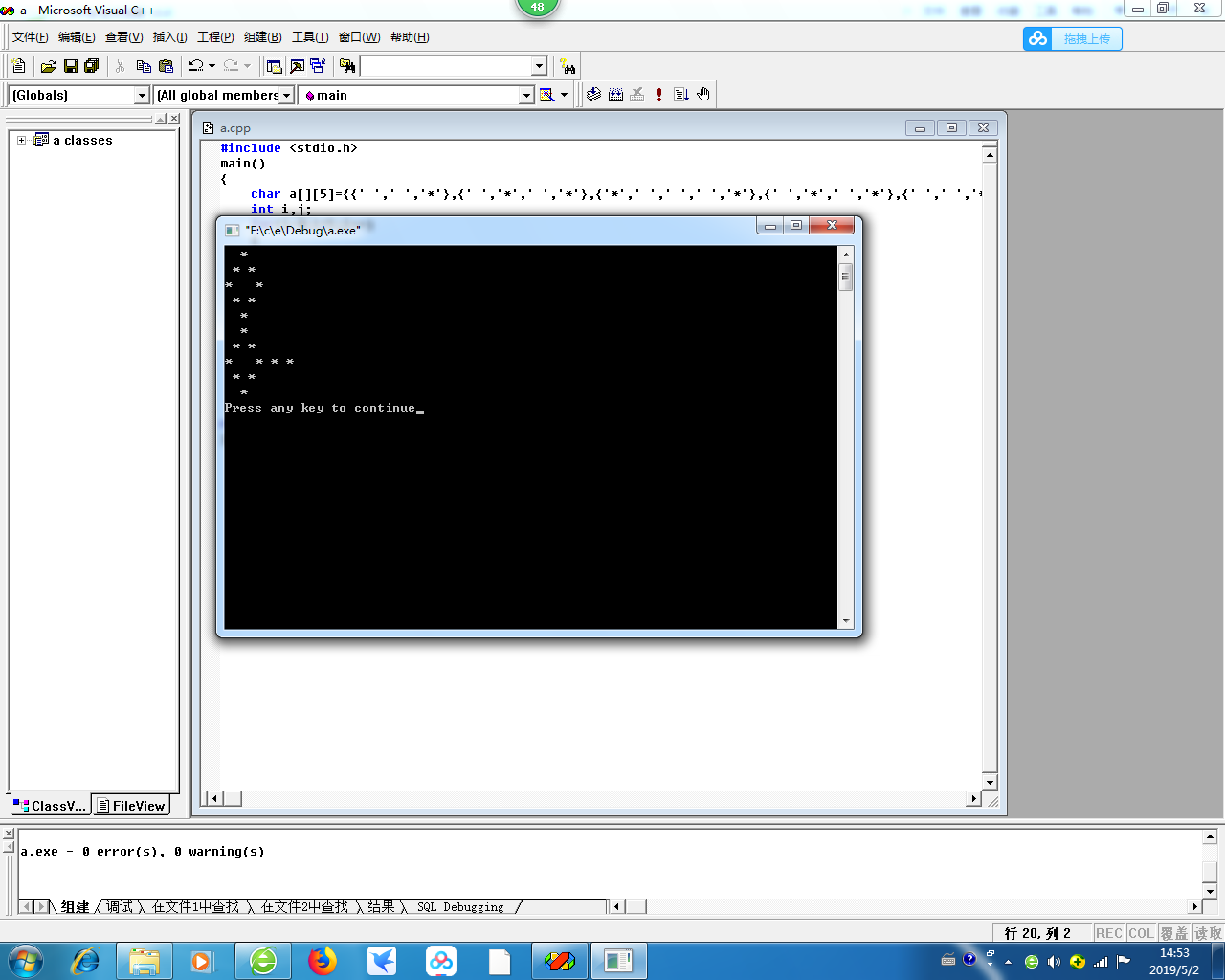 #include <stdio.h> main() { char a[][5]={{' ',' ','*'},{' ','*',' ','*'},{'*',' ',' ',' ','*'},{' ','*',' ','*'},{' ',' ','*'}}; int i,j; for(i=0;i<5;i++) { for(j=0;j<5;j++) printf("%c",a[i][j]); printf("\n"); } for(j=0;j<5;j++) {printf("%s",a[j]); printf("\n");} return 0; }