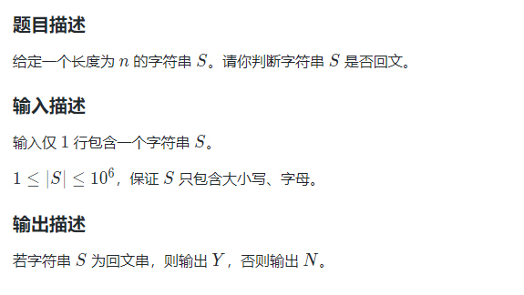 #include <stdio.h> #include <stdlib.h> #include <string.h> int main(int argc, char *argv[]) { char a[1000001]; int i,f=0,len; gets(a); len=strlen(a); if(len%2){ for(i=0;i<(len-1)/2;i++){ if(a[i]-'0'==a[len-1-i]-'0'){ f=0; }else{ f=1; break; } } }else{ for(i=0;i<len/2;i++){ if(a[i]-'0'==a[len-1-i]-'0'){ f=0; }else{ f=1; break; } } } if(!f) printf("Y"); else printf("N"); return 0; }