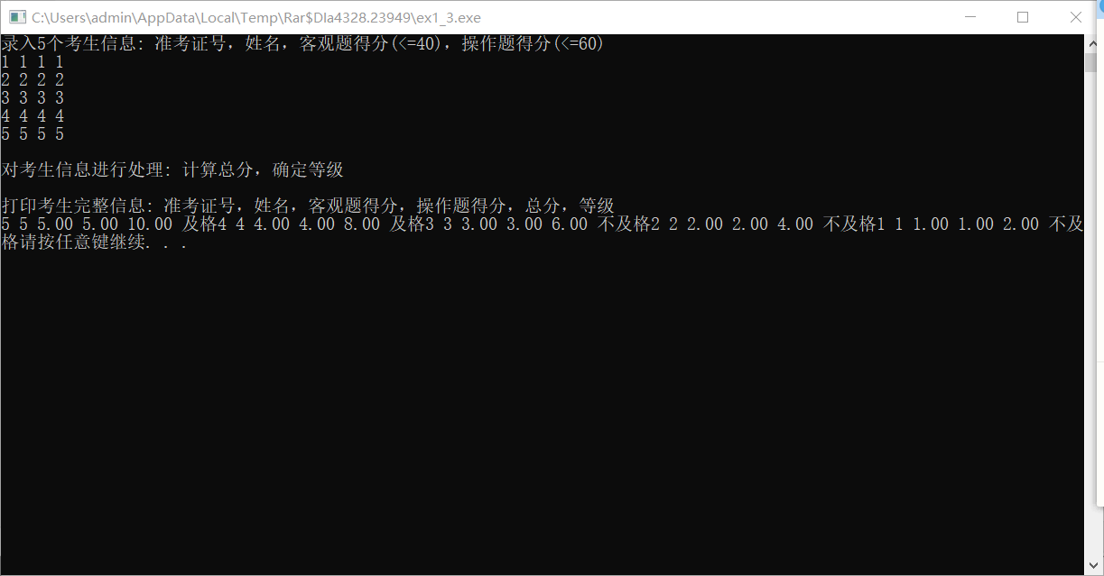 printf("\n打印考生完整信息: 准考证号,姓名,客观题得分,操作题得分,总分,等级\n");