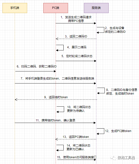 首先移动端扫描二维码,获取二维码 ID,然后将手机端登录的凭证(token)和 二维码 ID 作为参数发送给服务端