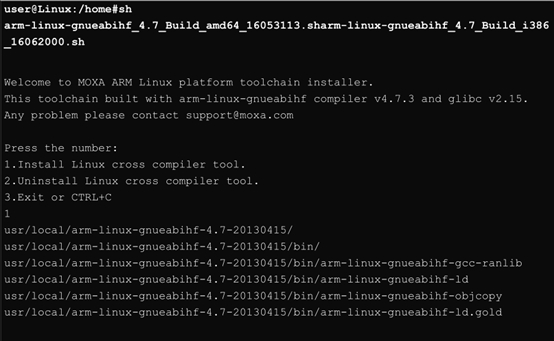 2、 安装编译器,sh arm-linux-gnueabihf_4.7_Build_amd64_16053113.sharm-linuxgnueabihf_4.7_Build_i386_16062000.sh,选择1进行安装