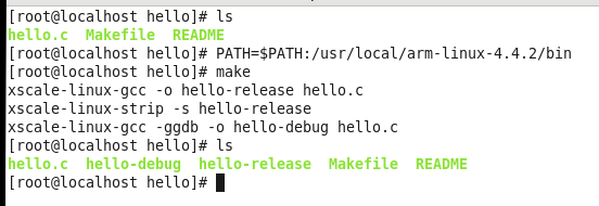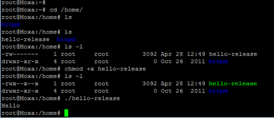 将生成的hello-release文件拷贝到UC-8410A下,用chmod +x hello-release,修改文件的权限后,在执行hello-release文件,可以下UC-8410A下显示hello