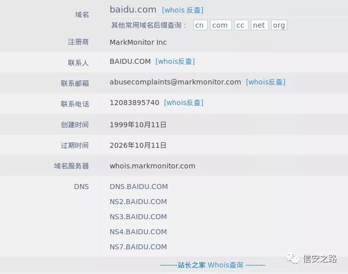 某些特定网站提供的功能能很好辅助我们完成信息收集的任务,例如站长之家,who.is 等这些网站能为我们提供 whois 的相关信息,减少我们的时间成本,而且在线获取信息简单方便。