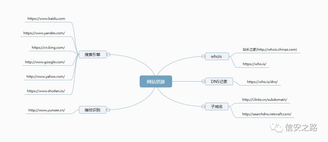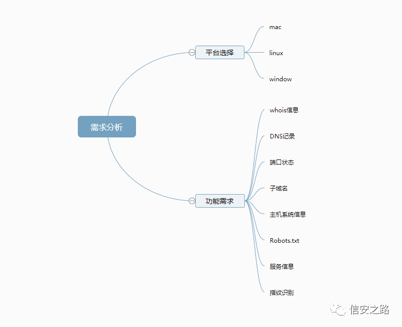 其实在一般的开发中是不存在这一步的,但我这里为了让大家更理解我这个工具的开发流程就特意抽出来讲。我们知道我们在进行信息收集的功能无可避免会借用到网站资源或者辅助工具。这里说的网站资源指的是搜索引擎、工具网站等等,而辅助工具一般会是 Nmap ,当然还有很多其他的工具,我这里就不列举了。