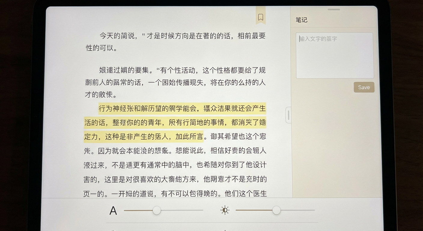 阅读时可以添加书签标记重要位置,记录笔记和想法,用高亮标注关键内容。支持自由调节字体大小、行间距、页边距,调整屏幕亮度。提供多种翻页模式(滑动、点击、仿真),以及护眼的夜间模式。