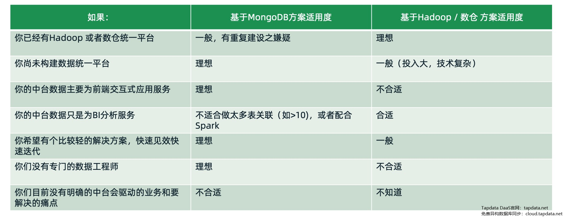 2.如果你还没有数据统一平台,没有数仓,没有这个Hadoop之类的话,这个时候我们觉得可以考虑一下,就是我们推荐的这种MongoDB的方案,会非常理想,因为我们相对来说是比较简单一些。起步会快,假设真的不行,你也可以很快就见效,我们叫做非常 fail fast,错就错的快一点,不要花很长的时间才发现不行,那如果你还没开始构建的话,一步到位就可以拿到。因为我们刚才讲的MongoDB在数据平台上是有很大的优势的。如果是Hadoop的话,最近几家合作的海外的那几家都三家只剩下了一家Cloudera,其他两家都已经被收掉了或者被合并了,这也是因为它的本身有很大的局限性,很复杂很难用,投入很大,收效比较小。