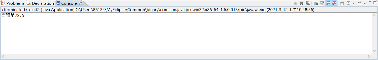 public class exct2 { /** * @param args */ public static void main(String[] args) { // TODO Auto-generated method stub int r=5; double s=r*r*3.14; System.out.println("面积是"+s); } }