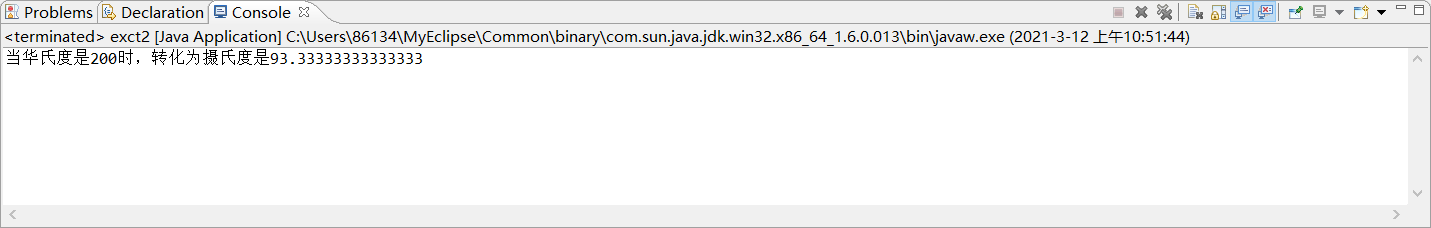 public class exct2 { /** * @param args */ public static void main(String[] args) { // TODO Auto-generated method stub double huaShiDu=200; double sheShiDu; sheShiDu=(huaShiDu-32)*5/9; System.out.println("当华氏度是200时,转化为摄氏度是"+sheShiDu); } }
