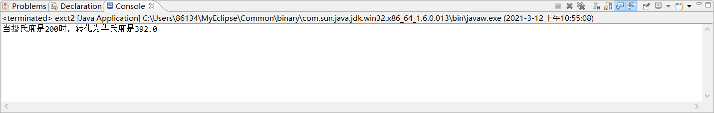 public class exct2 { /** * @param args */ public static void main(String[] args) { // TODO Auto-generated method stub double huaShiDu; double sheShiDu=200; huaShiDu=sheShiDu*9/5+32; // 摄氏度转华氏度 System.out.println("当摄氏度是200时,转化为华氏度是"+huaShiDu); } }