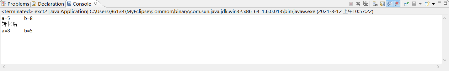 public class exct2 { /** * @param args */ public static void main(String[] args) { // TODO Auto-generated method stub int a=5; int b=8; int c; System.out.println("a="+a+"\tb="+b); System.out.println("转化后"); c=a; a=b; b=c; System.out.println("a="+a+"\tb="+b); } }