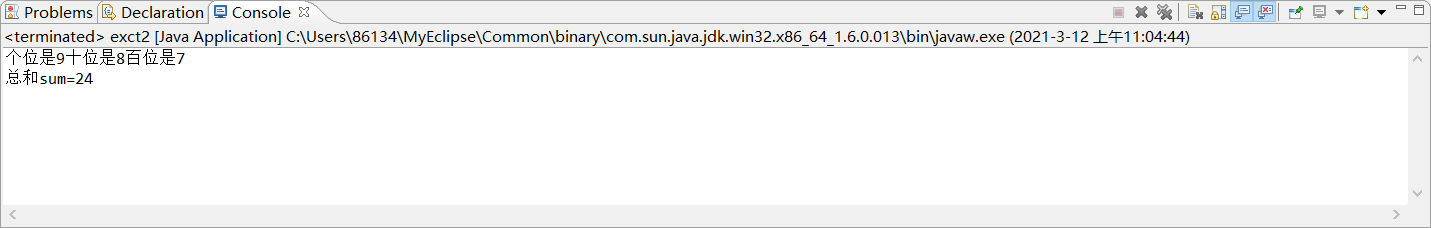 public class exct2 { /** * @param args */ public static void main(String[] args) { // TODO Auto-generated method stub int number=789; int ge=number%100%10; int shi=number%100/10; int bai=number/100; int sum=ge+shi+bai; System.out.println("个位是"+ge+"十位是"+shi+"百位是"+bai); System.out.println("总和sum="+sum); } }