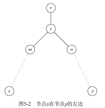 在树中选择任意两个互不存在祖先关系的节点x和y。由于有着“在左边”的定义,x和y中其中有一个是在另一个的左边。要分辨哪个在哪个左边,就要从x和y开始沿着路径向根节点回溯。而在某一点,可能是根节点,也可能是较低的点,这两条路径会在某个如图5-2所示的节点z相遇。从x和y到z的路径分别要经过两个不同的节点m和n,可能有 m=x 且(或) n =y,但一定有 m≠ n,否则这两条路径在z以下的某个位置就融合了。