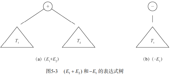 归纳。如果E1和E2这两个表达式分别是由树T1和T2表示的,那么表达式(E1+E2)就是由图所示的树表示的,其根节点标号为+。该根节点有两个子节点,依次分别是树T1和T2的根节点。同样,表达式(E1-E2)、(E1×E2)和(E1/E2)分别有着根节点标号-、×和/,且子树均为T1和T2的表达式树。最后,可以将一元减号运算符应用到表达式E1上。这里引入了标号为-的根节点,而其唯一的子节点是T1的根节点,表示(-E1)的树如图所示