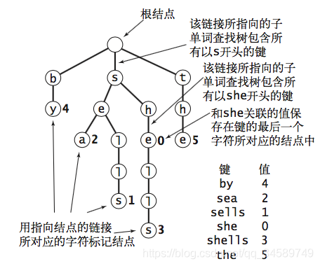 树可以用来表示一系列单词,其表示方式可以使检查给定字符序列是否为存在的单词变得非常有效率。在这类称为单词查找树的树中,除了根节点之外,每个节点都有与之相关联的字母。由某个节点n表示的字符串,就是从根节点到n的路径上的字母序列。给定一组单词,单词查找树的节点就是那些表示该集合中某个单词的前缀的字符串。节点的标号是由表示该节点的字母,以及表明从根节点到该节点的字母串能否构成完整单词的布尔值组成的。如果能,就用布尔值1表示,如果不能,就用0表示。