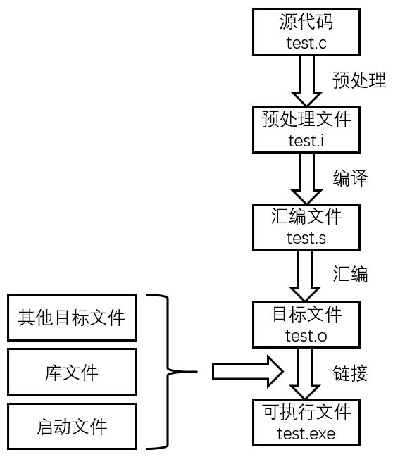 源代码文件.c → 把源代码转换为机器语言代码,并把结果放在目标代码文件(目标文件)中 → 链接器把目标代码、系统的标准启动代码和库代码这3部分合并成一个文件(可执行文件)