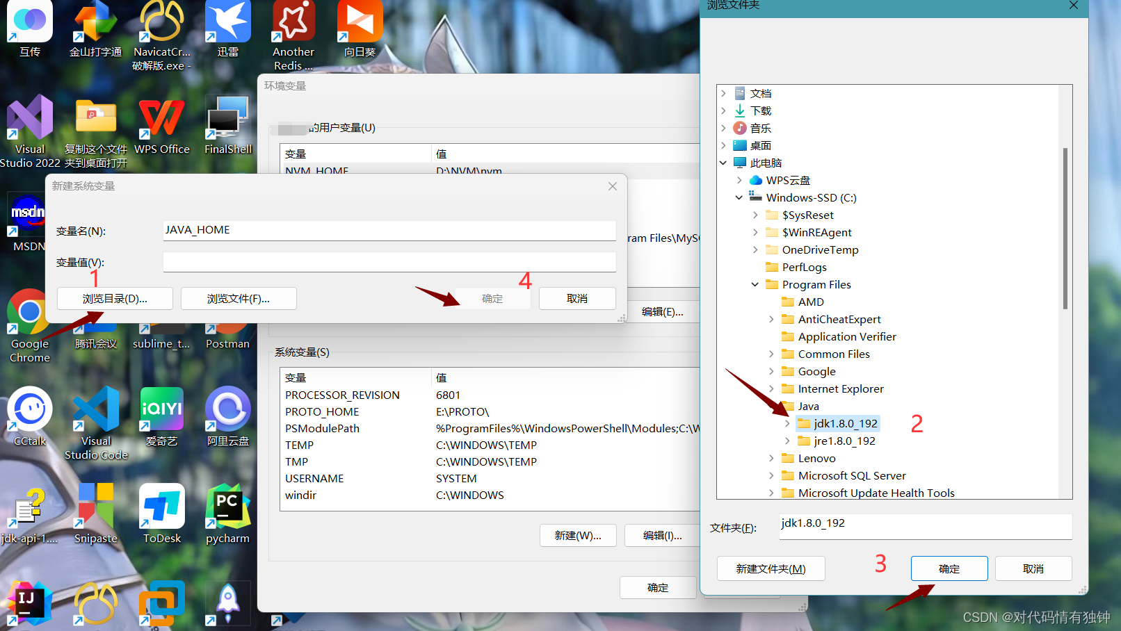 这需要注意的一点是,一定是要选中java下面的那个jdk1.8.0_192,然后先不要着急点确定,因为此时还要更改一个叫做path的系统变量