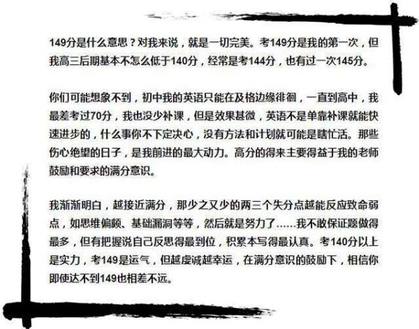 学习别人的成功经验可谓是一条捷径。衡中2016届毕业生李江珊的一篇英语考试心得,她今年的高考英语分数是149分(全国卷英语满分150分)。这分数不得不说是真学霸!话不多说,看看英语学霸是怎么说的?