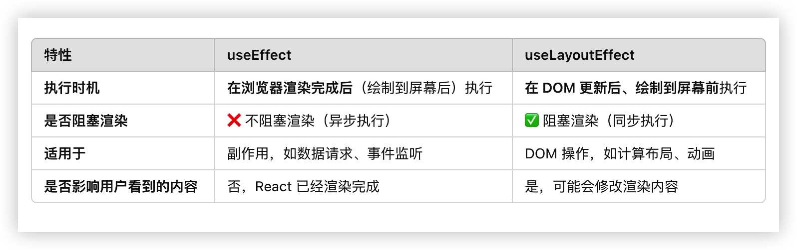 使用浅比较判断各个依赖项是否发生了变化,对于基本类型(如 string、number、boolean),只比较值本身;对于引用类型(如对象、数组、函数),只比较引用是否相同(即内存地址),而不比较内容是否发生了变化。