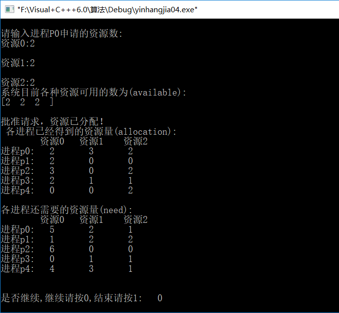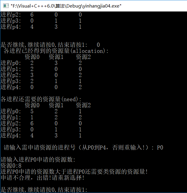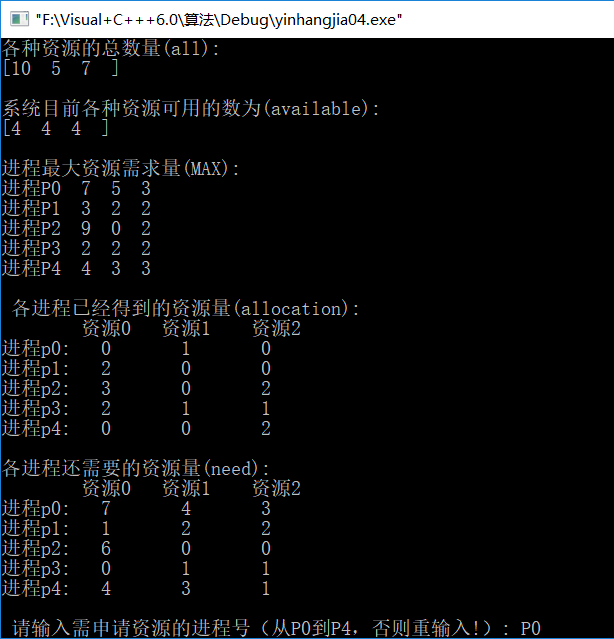 printf(" 请输入需申请资源的进程号(从P0到P%d,否则重输入!): P",M-1);