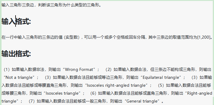 (1)如果输入数据非法,则输出“Wrong Format”; (2)如果输入数据合法,但三条边不能构成三角形,则输出“Not a triangle”; (3)如果输入数据合法且能够成等边三角形,则输出“Equilateral triangle”; (3)如果输入数据合法且能够成等腰直角三角形,则输出“Isosceles right-angled triangle”; (5)如果输入数据合法且能够成等腰三角形,则输出“Isosceles triangle”; (6)如果输入数据合法且能够成直角三角形,则输出“Right-angled triangle”; (7)如果输入数据合法且能够成一般三角形,则输出“General triangle”。