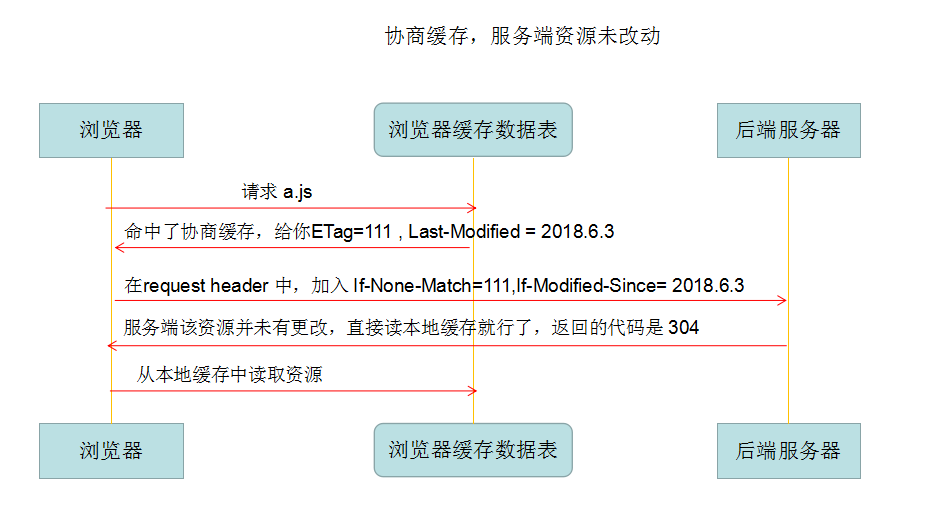 未改动: 请求资源 => 查询浏览器缓存表返回Etag跟Last-Modified => 请求头带上If-None-Match跟If-Modified-Since => 资源未改变返回304从本地缓存中读取
