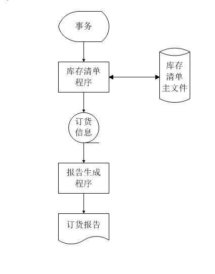 库中的CRT终端输入到计算机中;系统中的库存清单程序对事务进行处理,更新存储在磁盘上的库存清单主文件,并且把必要的订货