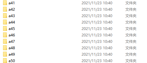 1 import os 2 file_path=os.path.abspath(r"E:\20211015") 3 for i in range(41,51): 4 a="a{}".format(i) 5 file_name=file_path + "\\"+a 6 os.makedirs(file_name)