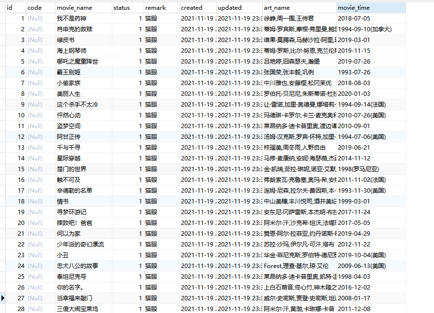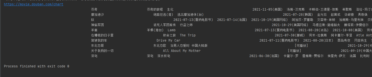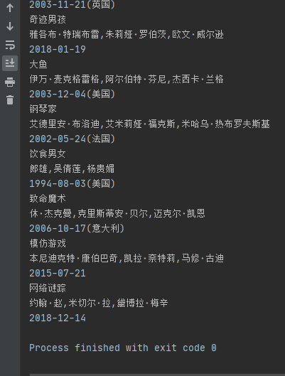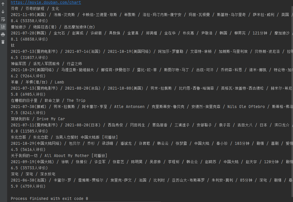 1 import time 2 import requests 3 from model import * 4 from bs4 import BeautifulSoup 5 headers = {"Content-Type": "text/html; charset=utf-8", 6 "User-Agent": "Mozilla/5.0 (Windows NT 10.0; Win64; x64) AppleWebKit/537.36 (KHTML, like Gecko) Chrome/95.0.4638.69 Safari/537.36"} 7 8 url = f"https://www.maoyan.com/board/4?timeStamp=1637291300330&channelId=40011&index=2&signKey=c286a92c2bb667036254185fde905f09&sVersion=1" 9 r = requests.get(url, timeout=3, headers=headers) 10 print(url) 11 soup = BeautifulSoup(r.text, "html5lib") 12 bb = soup.find('ul', class_="list-pager").text.replace("\n", "").split(" ") 13 page = [i for i in bb if i != ''] 14 print(page[-2]) 15 for i in range(0,int(page[-2])): 16 p=i*10 17 print(i) 18 url = f"https://www.maoyan.com/board/4?timeStamp=1637053092611&sVersion=1&index=7&signKey=52df1051b8c1478e914905882e09e10a&channelId=40011&requestCode=c30fbaba9d9f7b73a53f83fe71ac0ec13ztmp&offset={p}" 19 r = requests.get(url, timeout=3, headers=headers) 20 print(url) 21 time.sleep(3) 22 print(r.status_code) 23 soup = BeautifulSoup(r.text, "html5lib") 24 # 获取某标签的属性值 25 soup1 = BeautifulSoup(r.text, "html5lib") 26 aa = soup.find_all('div', class_="board-item-content") 27 for a in aa: 28 bb = [] 29 datalist={} 30 dd = a.find('p', class_="name") 31 ff = a.find('p', class_="star") 32 ss = a.find('p', class_="releasetime") 33 34 movie_name=dd.getText().replace("\n","") 35 art_name=ff.getText().replace("\n","").replace(" ","").replace("主演:","") 36 movie_time=ss.getText().replace("\n", "").replace(" ", "").replace("上映时间:","") 37 print(movie_name) 38 print(art_name) 39 print(movie_time) 40 bb.append(dict(movie_name=movie_name, art_name=art_name, movie_time=movie_time, remark='猫眼')) 41 for l in bb: 42 find_data = SQLsession.query(Infos).filter_by(movie_name=l['movie_name'], remark='猫眼').first() 43 if not find_data: 44 SQLsession.add(Infos(**l)) 45 SQLsession.commit()