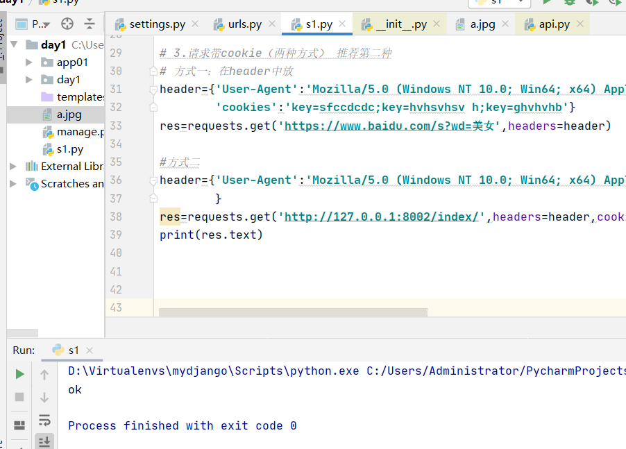 #方式二 header={'User-Agent':'Mozilla/5.0 (Windows NT 10.0; Win64; x64) AppleWebKit/537.36 (KHTML, like Gecko) Chrome/122.0.0.0 Safari/537.36' } res=requests.get('http://127.0.0.1:8002/index/',headers=header,cookies={'key':'sfccdcdc'}) #这里的网址是我们重开一个项目当做服务器,运行后的网址 print(res.text)
