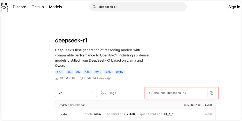 这里搜索deepseek安装deepseek-r1模型,左侧有对应的标签,默认是7b体量,读者需要根据自己机器情况安装合适的体量模型