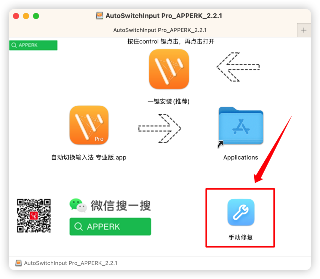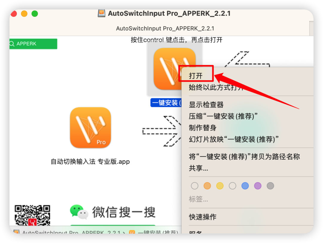 1. 双击打开「AutoSwitchInput Pro_APPERK_2.2.1.dmg」,将「自动切换输入法 专业版.app 」拖入「Applications」文件夹或者使用一键安装程序安装如下图: