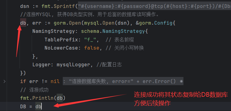 3.连接数据库的重点语句是gorm.open(数据库类型.open(数据库拼接地址)),在Open中添加&gorm.config(根据需求添加相关配置)