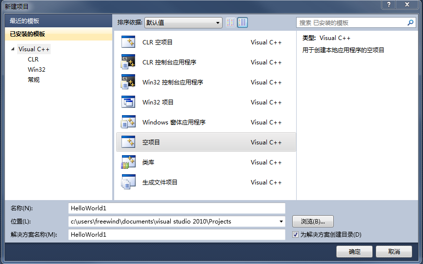 打开Visual C++ 2010 express,创建一个新项目(空项目):