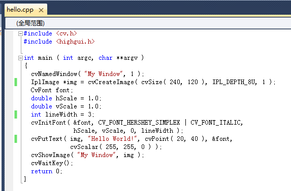 #include <cv.h> #include <highgui.h> int main ( int argc, char **argv ) { cvNamedWindow( "My Window", 1 ); IplImage *img = cvCreateImage( cvSize( 240, 120 ), IPL_DEPTH_8U, 1 ); CvFont font; double hScale = 1.0; double vScale = 1.0; int lineWidth = 3; cvInitFont( &font, CV_FONT_HERSHEY_SIMPLEX | CV_FONT_ITALIC, hScale, vScale, 0, lineWidth ); cvPutText( img, "Hello World!", cvPoint( 20, 40 ), &font, cvScalar( 255, 255, 0 ) ); cvShowImage( "My Window", img ); cvWaitKey(); return 0; }