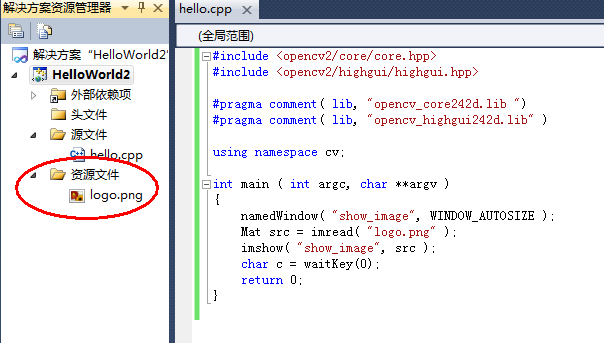右键点“HelloWorld2项目”->“增加”->“现有项”,选中该logo.png。这时项目的“资源文件”下,就会多一个logo.png出来。