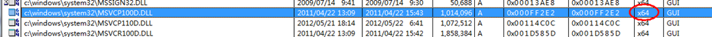 后来朋友又使用了DependencyWalker,发现它显示的MSVCP100D.DLL两个文件,却是x86的: