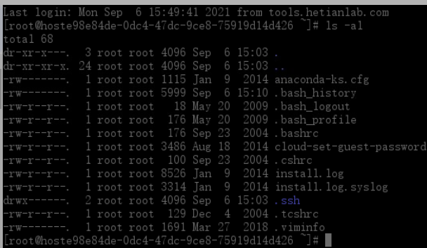 ①ls -al:列出所有档案的详细权限与属性(包括隐藏文件)(见图1.1)