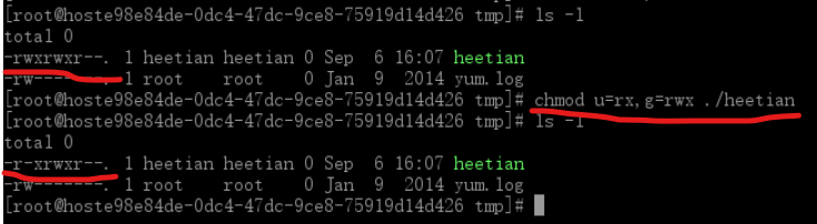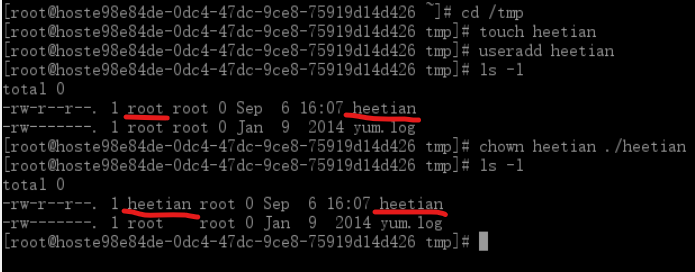注:1.现在/tmp目录下新建文件heetian,再建立用户heetian,显示当前目录下所有档案及其详细权限属性,可以看到,heetian目录的拥有者是root,使用chown命令后,就将拥有者改成heetian了,