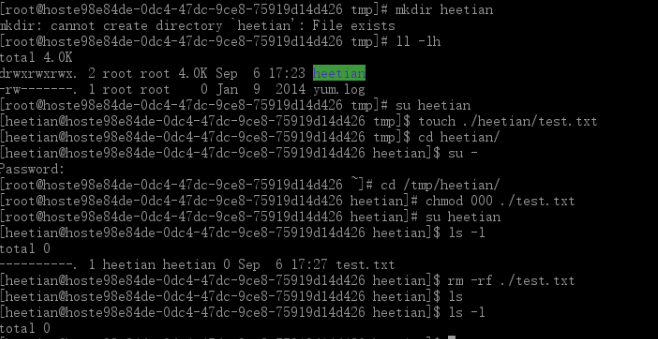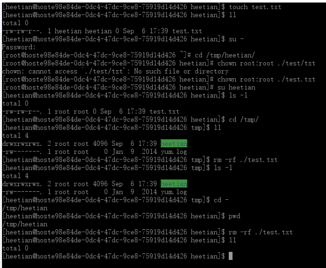 为什么/tmp/heetian/test.txt文件所有者和用户组都是root,对于heetian来说只有可读权限,为啥heetian也能把它删除了?