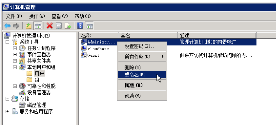 ①账号安全,更改管理员账户:开始->运行->compmgmt.msc(计算机管理)->本地用户和组->用户,右击Administrator账户并选择“重命名”,并输入新的账户名称