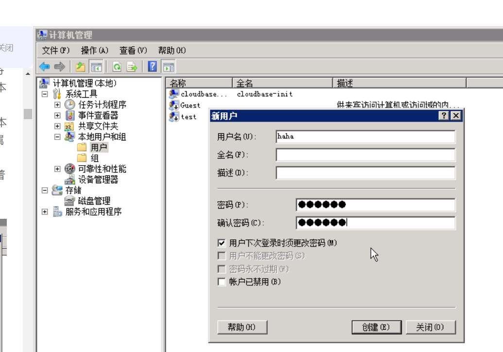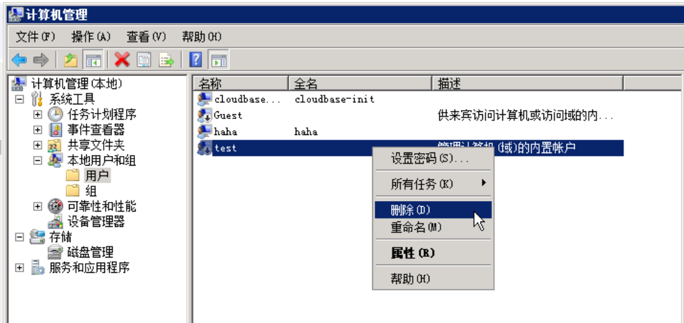 ③删除无用的账户: 开始->运行->compmgmt.msc(计算机管理)->本地用户和组,查看是否有不用的账号,系统账号所属组是否正确以及guest账号是否锁定