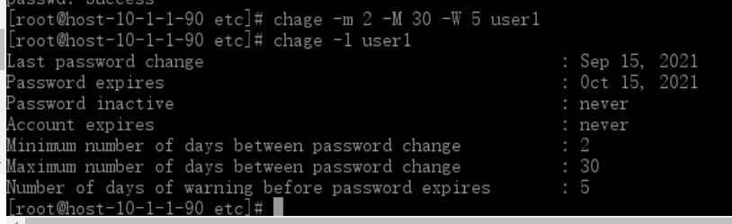 例如下面的命令要求用户user1两天内不能更改口令,并且口令最长的存活期为30天,并且口令过期前5天通知用户